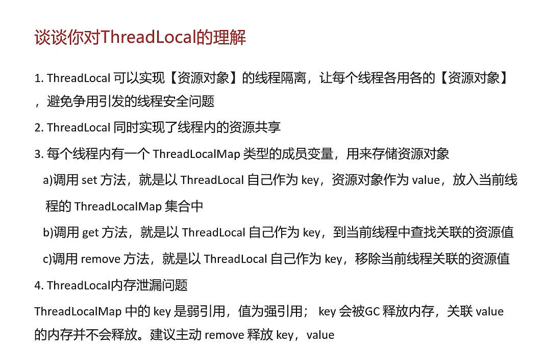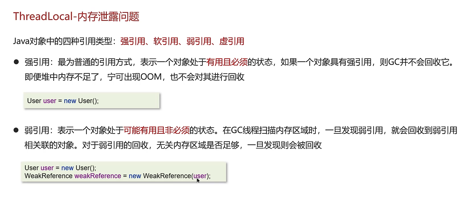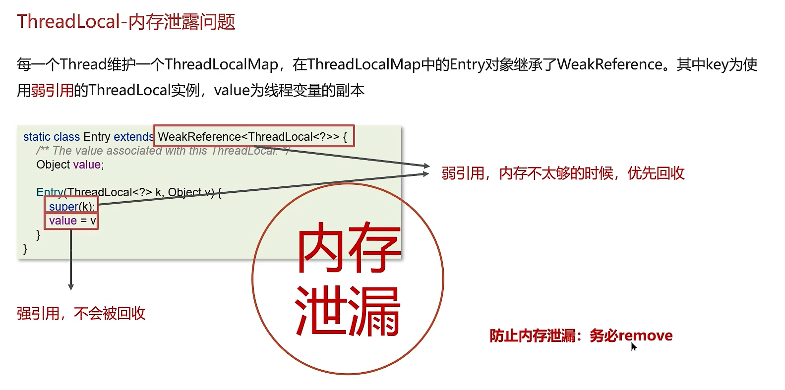 )时,由于ThreadLocalMap的Key是弱引用,它会在下一次GC时被回收。然而,对应的Value由于是强引用,只要创建它的线程没有结束(例如,是线程池中的线程,会复用不会结束),这个Value就会一直存在于线程的ThreadLocalMap中,但却永远无法被访问到(因为Key没了),从而造成内存泄漏。小结: