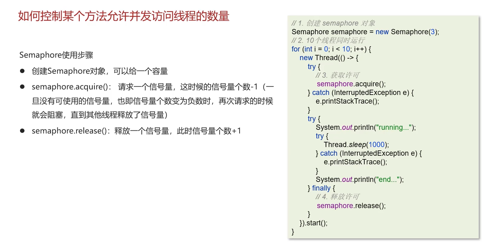 有时我们需要限制某个具体方法或资源块的并发访问数,而不是控制整个线程池的规模。这时,线程池显得过重,更轻量级的 Semaphore