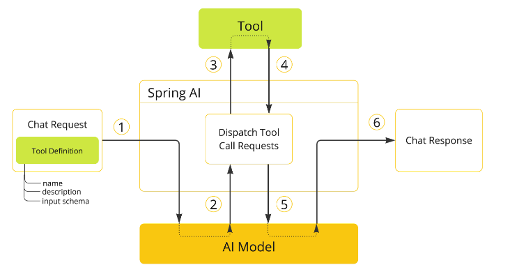 Spring AI 提供了方便的 API 来定义工具、解决来自模型的工具调用请求以及执行工具调用,下面是Spring AI工具的调用流程,引用至官方图: