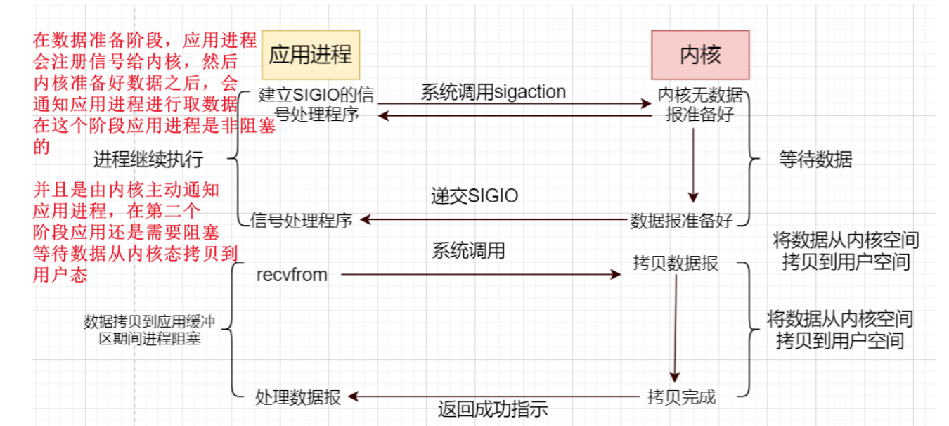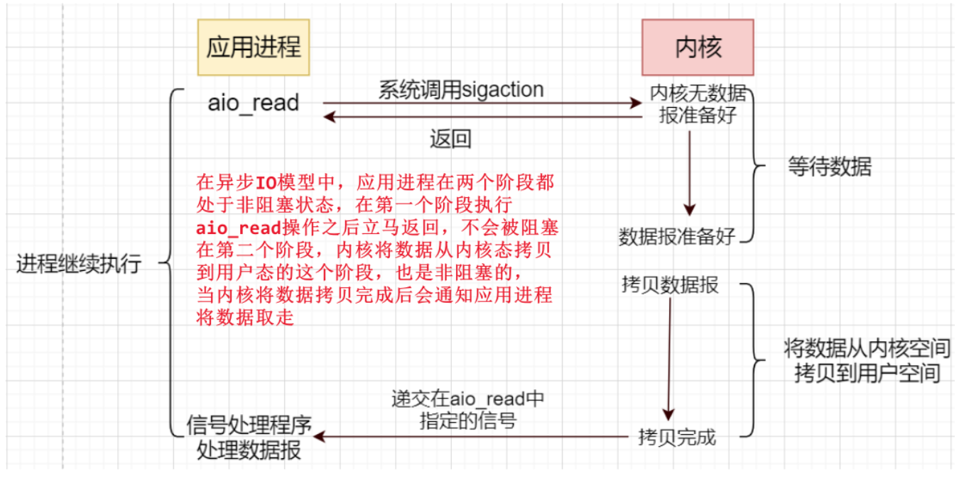 ),并指定信号处理函数,调用后立即返回,不阻塞; - 内核在数据准备好时,向应用程序发送