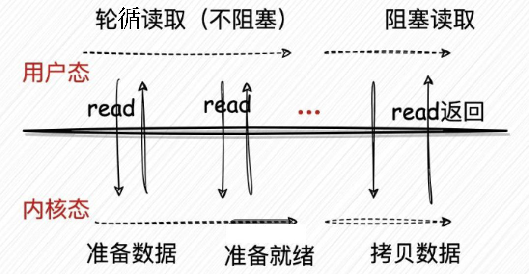 错误,应用程序不阻塞,可做其他事; - 应用程序通过轮询(反复调用 IO 函数) 检查数据是否就绪,直到数据准备好;