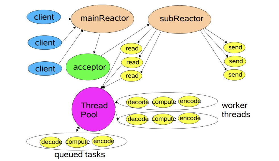 简言之,主从多线程模型由多个 Reactor 线程组成,每个 Reactor 线程都有独立的 Selector 对象。MainReactor 仅负责处理客户端连接的 Accept 事件,连接建立成功后将新创建的连接对象注册至 SubReactor。再由 SubReactor 分配线程池中的 I/O 线程与其连接绑定,它将负责连接生命周期内所有的 I/O 事件。