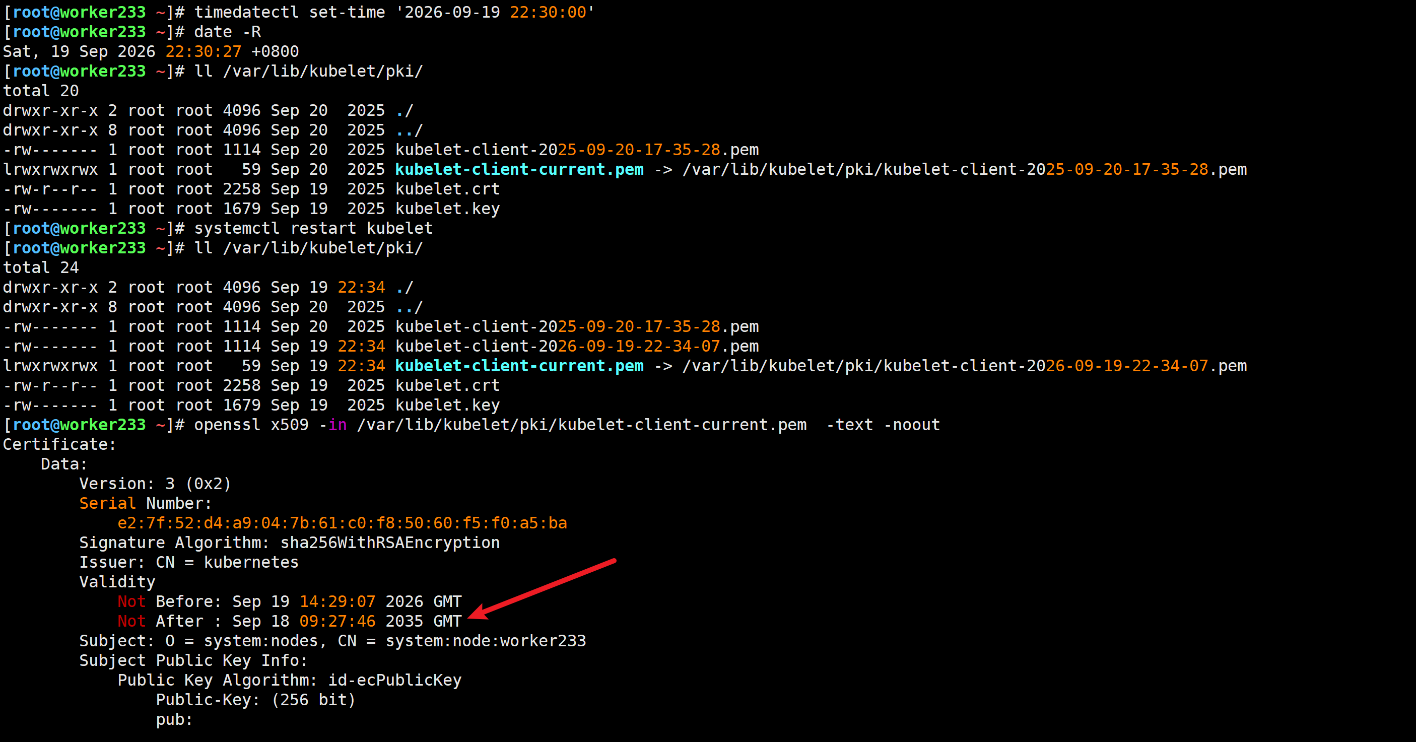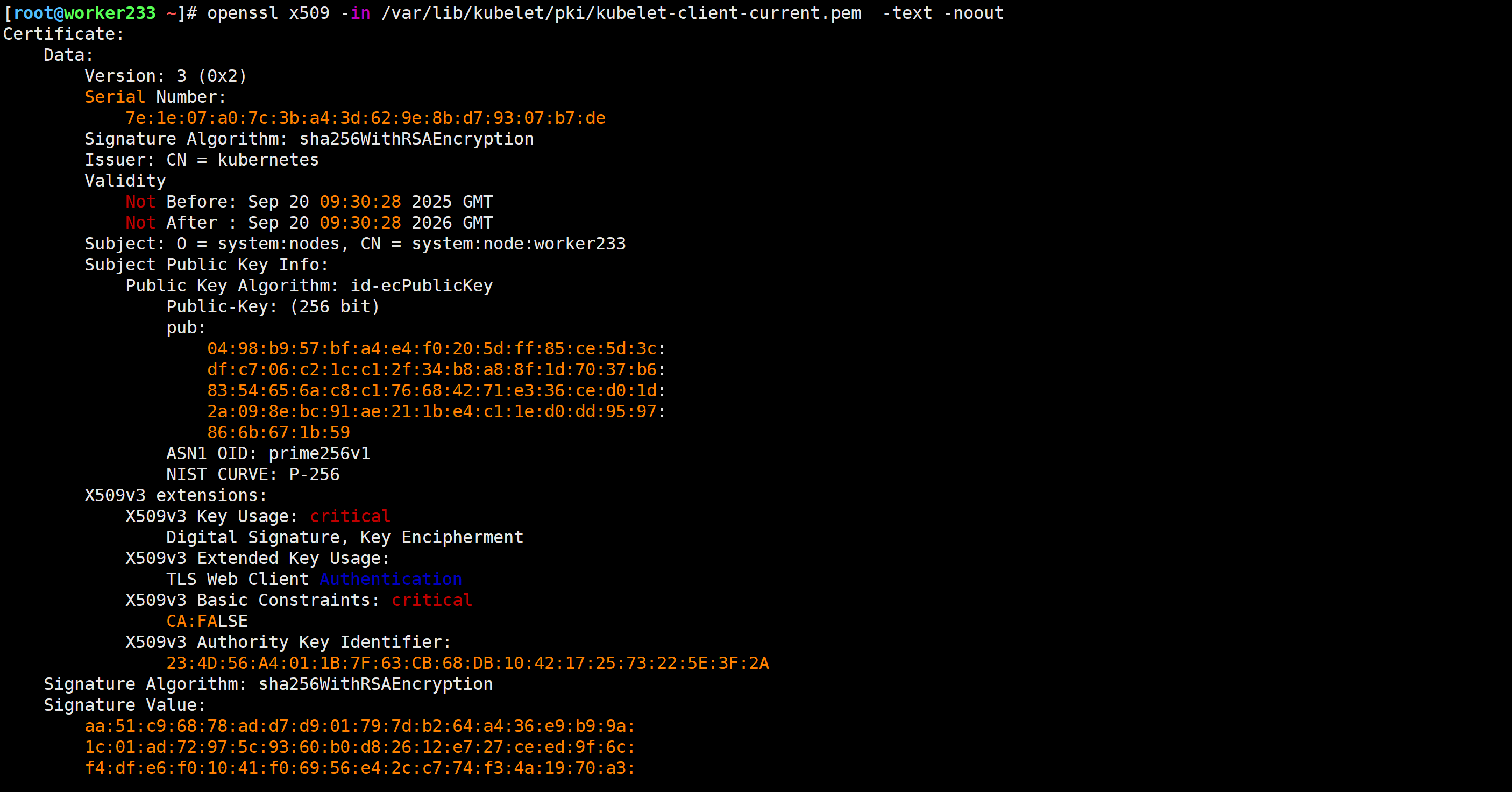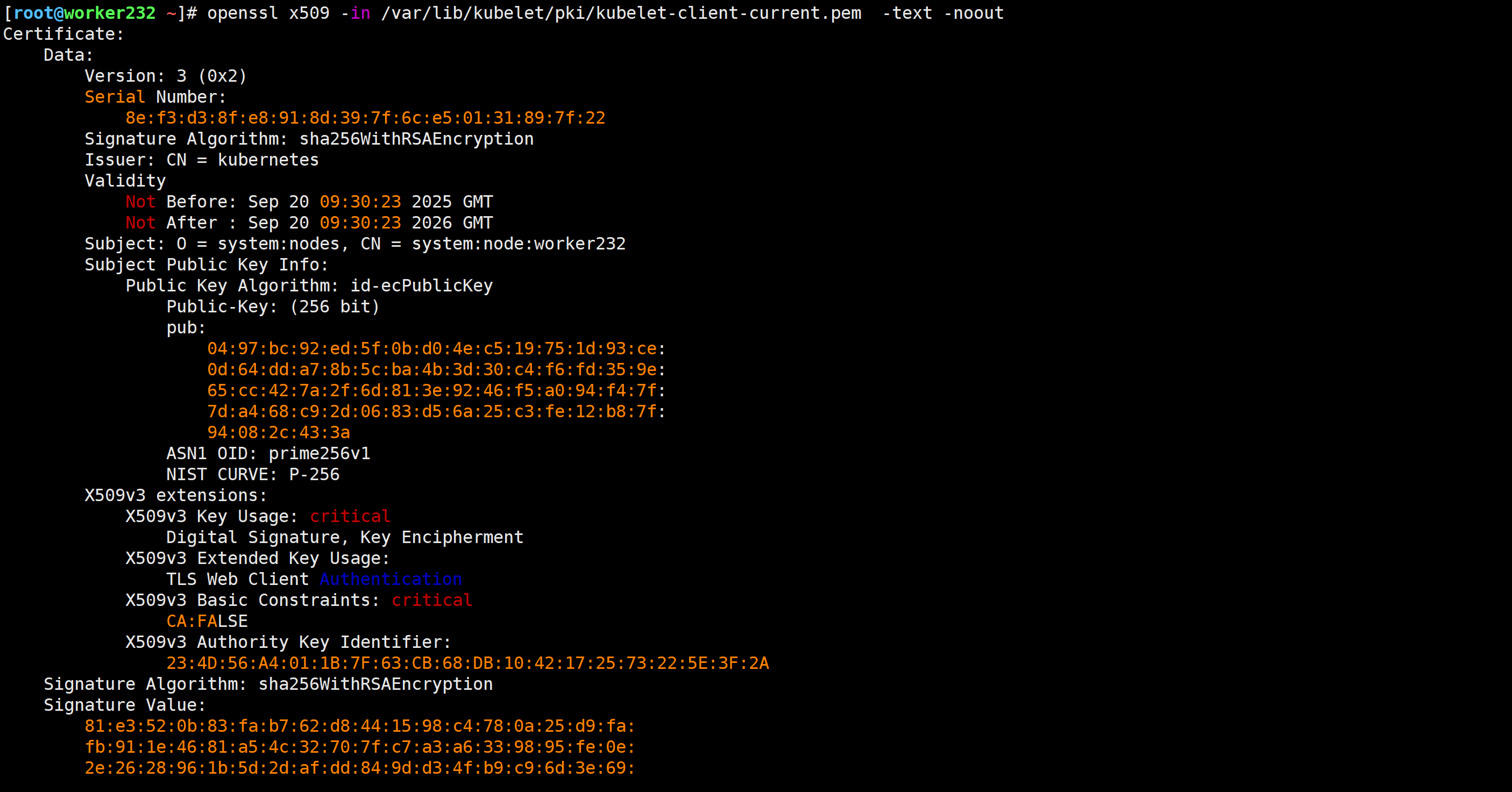 openssl x509 -in /var/lib/kubelet/pki/kubelet-client-current.pem -text -noout
