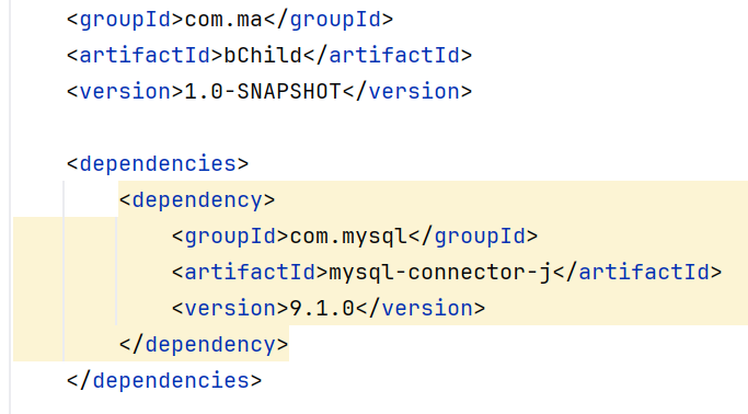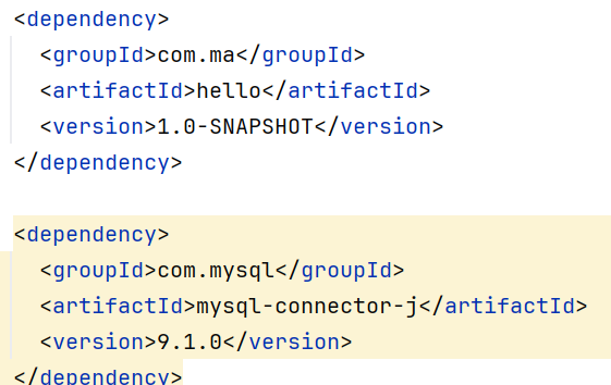 <dependency><groupId>com.mysql</groupId><artifactId>mysql-connector-j</artifactId><version>9.1.0</version></dependency>