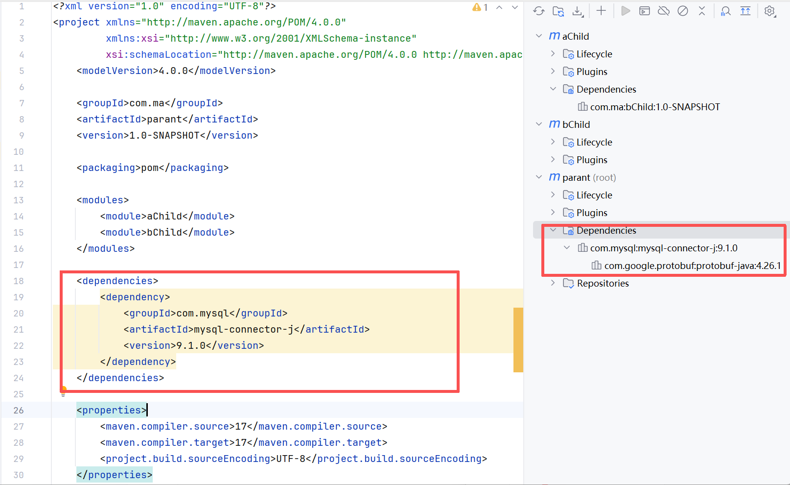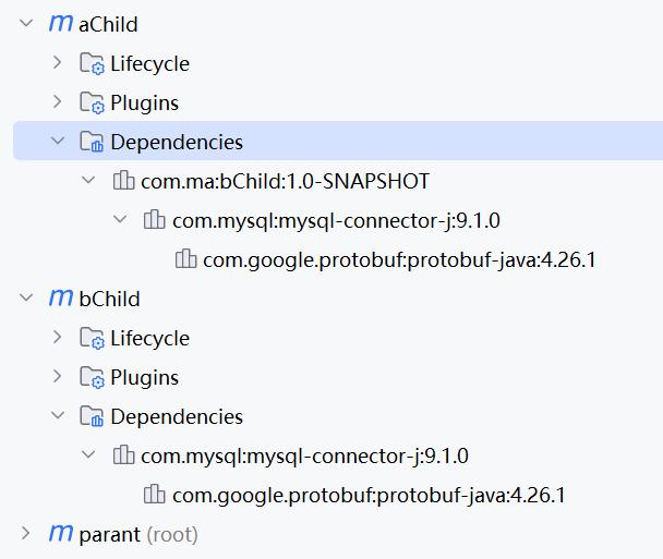 在 parent 里面添加了依赖,可以看到 aChild 和 bChild 都没有出现依赖