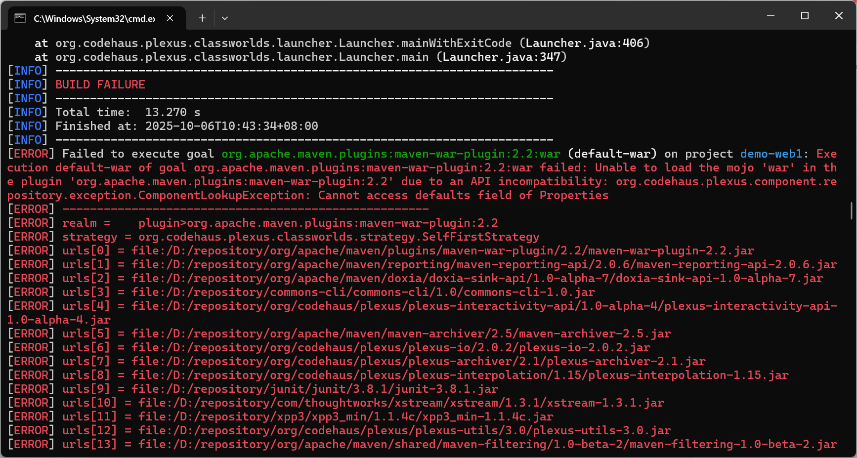 这个问题也是因为 Maven 自带的 maven-war-plugin 版本太老(2.2),和当前使用的 JDK 17 + Maven 3.8.8 存在不兼容问题。