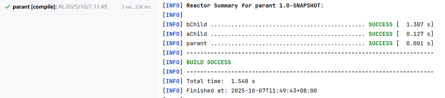当执行父聚合项目的编译命令(如 mvn clean install)时,所有子项目会按顺序编译。