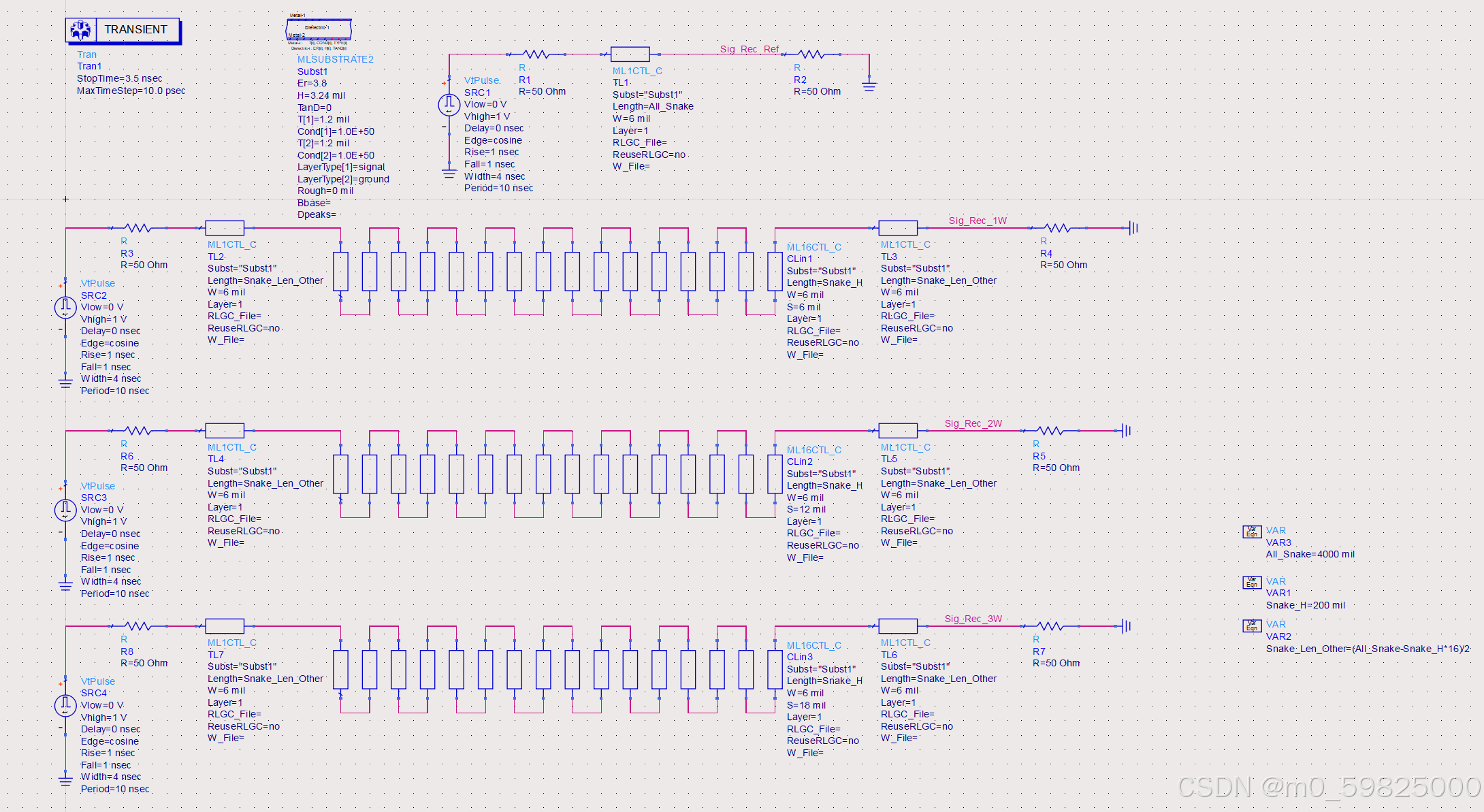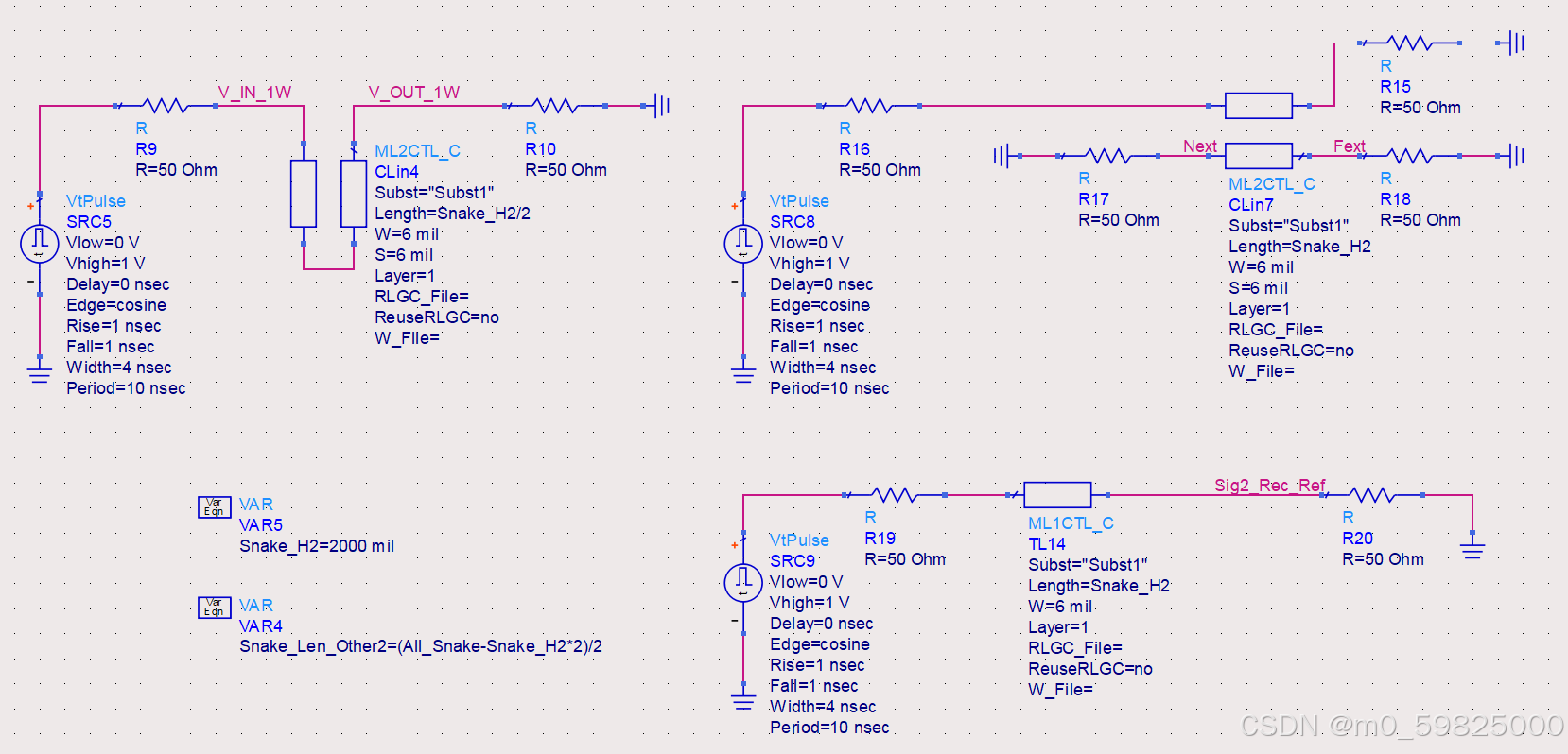 使用ADS仿真蛇形走线串扰对信号延时的影响,使用ML16TL_C模型仿真蛇形走线,参数Length表示蛇形走线的高度,参数S表示蛇形走线中的Gap值