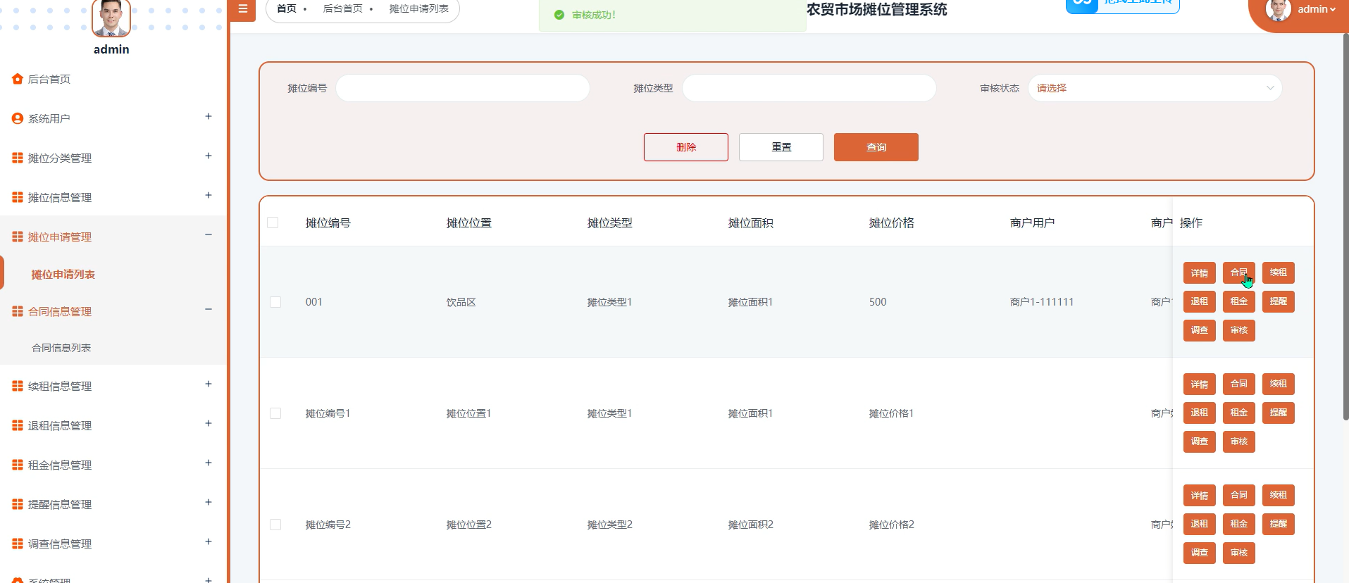 摊位查询与租赁:空闲摊位查询(按位置/价格/面积筛选)、在线申请租赁、续租/退租申请。