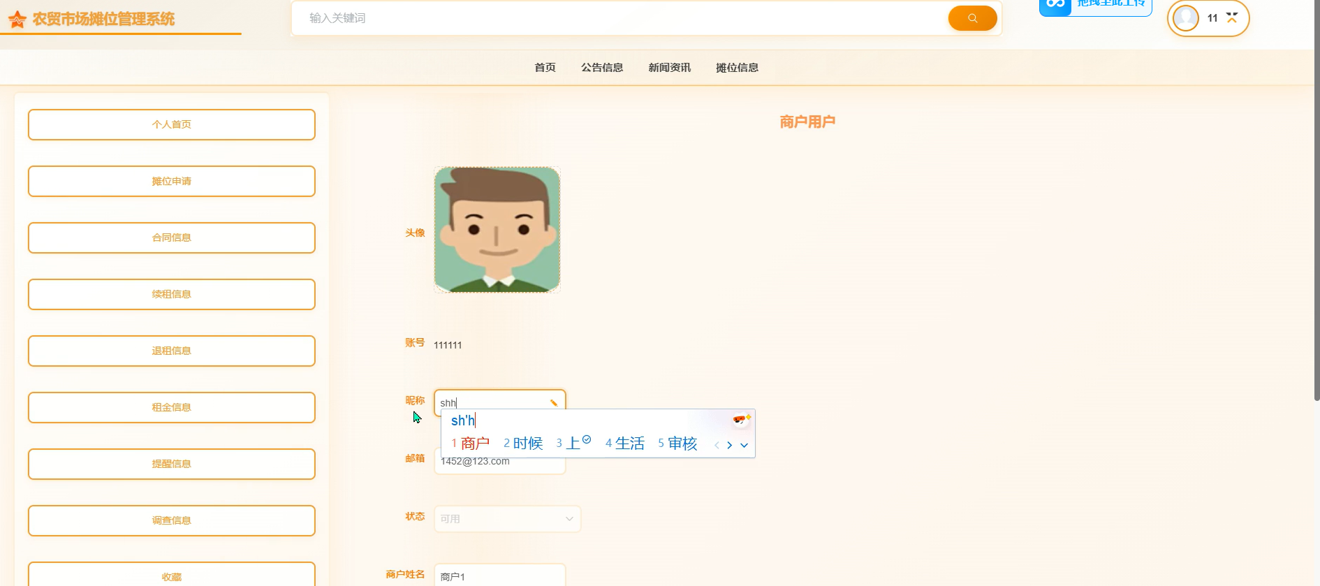 摊位管理:摊位信息录入、摊位信息查询、状态更新(空闲/租赁中/到期)、位置可视化、续租/退租申请管理。