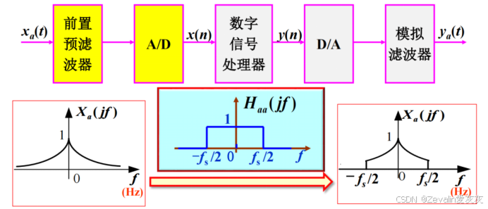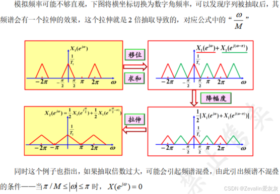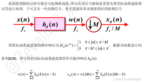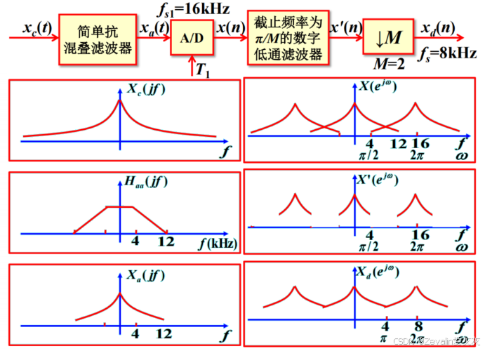 对此可考虑引入抽取系统,先让输入信号经过一个非理想的抗混叠滤波器,然后进行采样,采样后的信号必然会有频谱混叠现象,但只要保证混叠处的频率分量不是数字信号处理需要的频率分量,那么就可以使用一个截止频率为的数字低通滤波器将其滤除,然后再通过M倍抽取将频谱拉伸即可