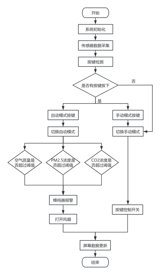 7)自动模式:当空气质量、PM2.5、CO2、温湿度等数据超过阈值,自动打开风扇并且开启声光报警