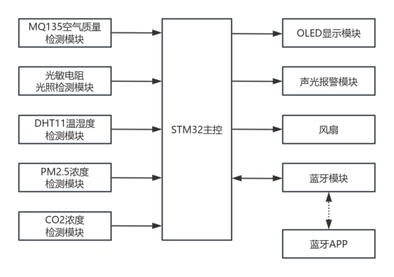 1)传感器检测:空气质量、光照强度、温湿度、PM2.5粉尘传感器、CO2浓度传感器