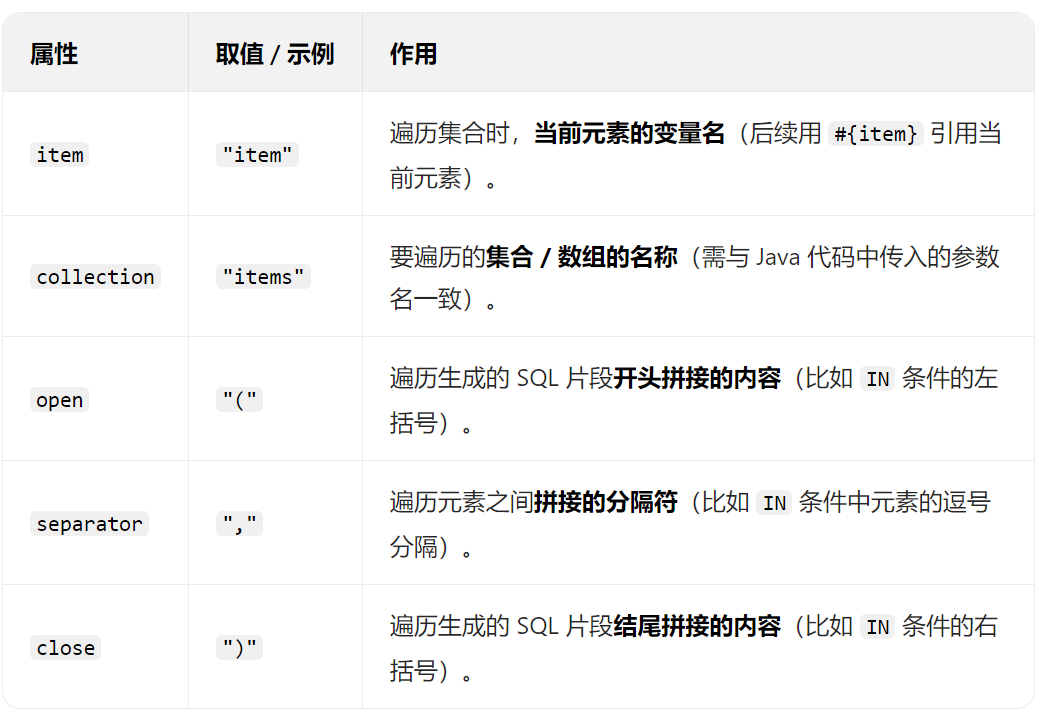 是 MyBatis 专为 “遍历集合 / 数组,拼接 SQL 片段” 设计的标签,常用于: