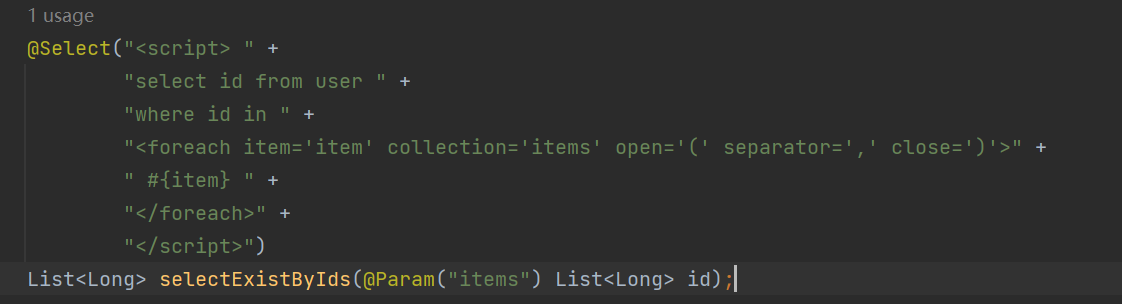 标签的使用示例,用于在 SQL 中循环遍历集合,动态生成批量操作的语法(比如 IN