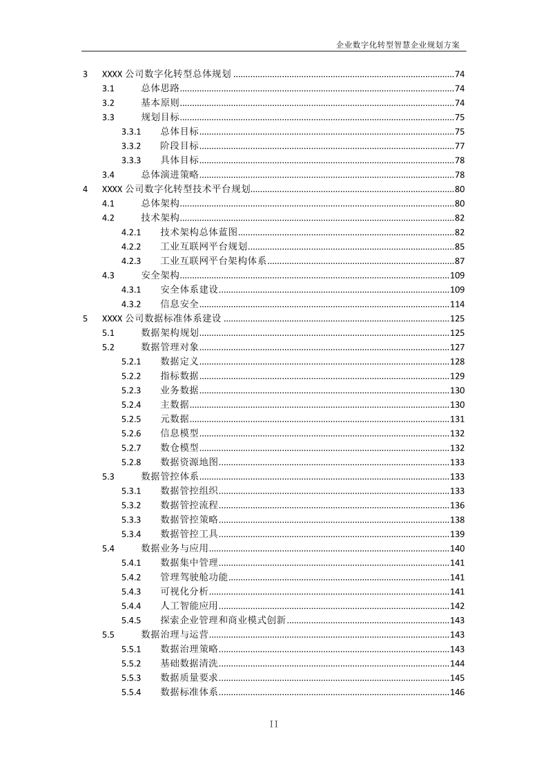 本文档为旨在响应国家战略、行业趋势及集团政策,构建智慧企业。方案首先概述了公司现状、面临的形势及集团政策导向,明确了智慧企业的定义、内涵、特征及建设路径。随后,通过现状分析及诊断,识别了公司在业务管理、数字化能力等方面的不足,并提出了针对性的提升方向。在总体规划部分,确立了数字化转型的总体思路、基本原则、目标及演进策略,旨在实现绿色低碳、多能互补、高效协同、数字智慧的发展目标。技术平台规划方面,构建了包括工业互联网平台在内的技术架构,并强调了安全体系的建设。同时,数据标准体系的建设被视为关键,通过数据架构规划、数据管理对象定义、数据管控体系建立等,确保数据质量与安全,支撑数据业务与应用的发展。最后,针对业务领域制定了详细的数字化转型规划,包括业务架构、应用架构的蓝图设计,以及智慧企业集约化管控、数字化运营中心、智慧电厂等具体应用场景的规划,旨在全面提升公司的数字化水平,推动智慧企业建设。