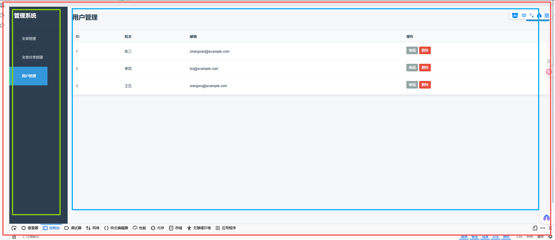 {path: "/AdminFrame",name: "AdminFrame",component: AdminFrame, // 父组件 - 包含布局children: [ // 子路由 - 在父组件的 router-view 中显示{path: "User", // → /AdminFrame/Username: "User",component: User},{path: "Classify", // → /AdminFrame/Classifyname: "Classify",component: Classify},{path: "Article", // → /AdminFrame/Article name: "Article", component: Article}]
