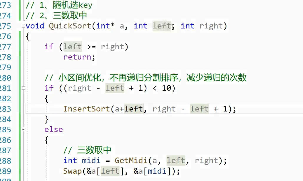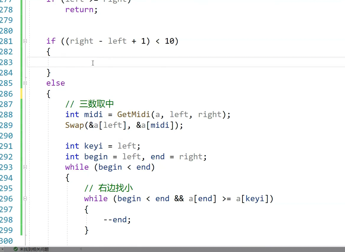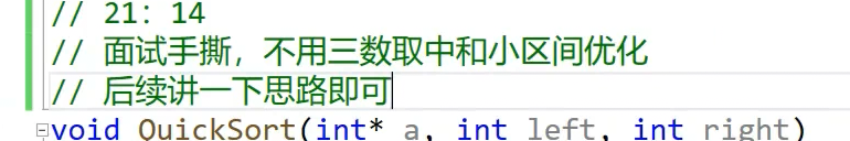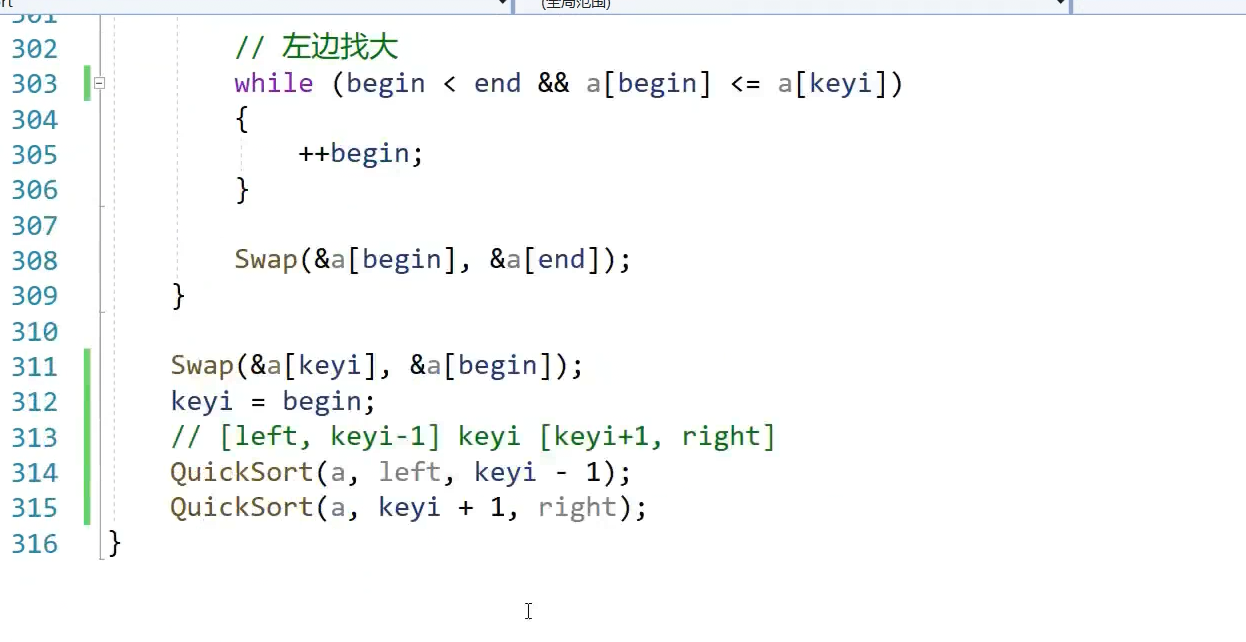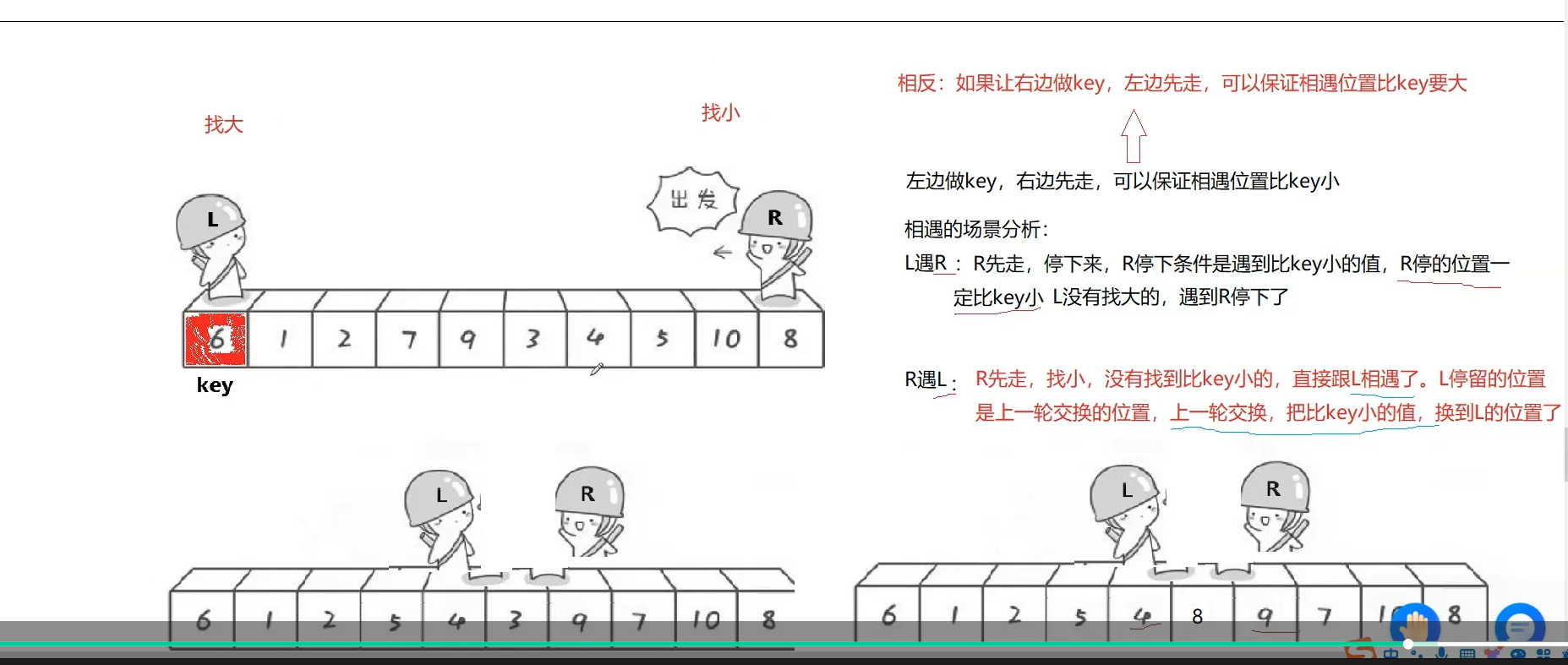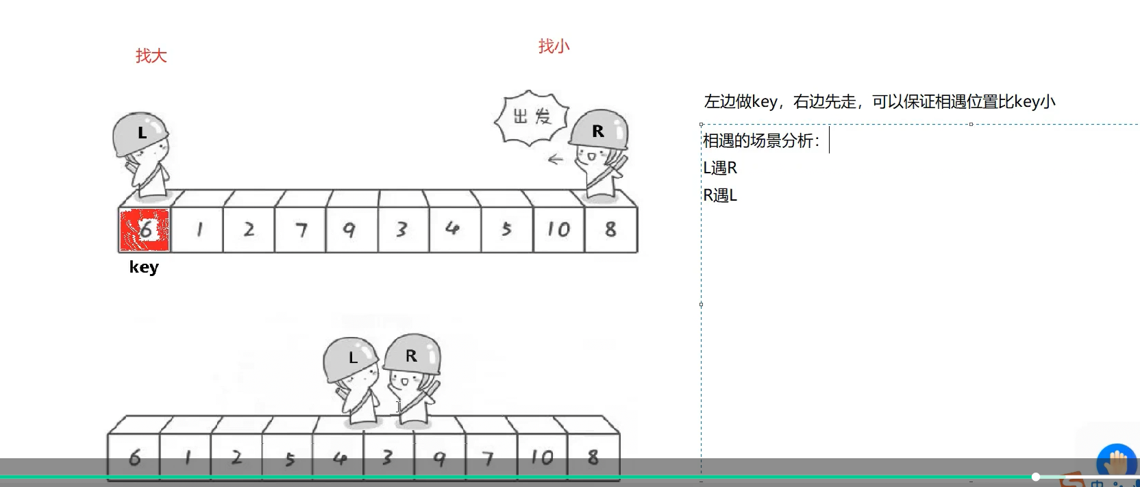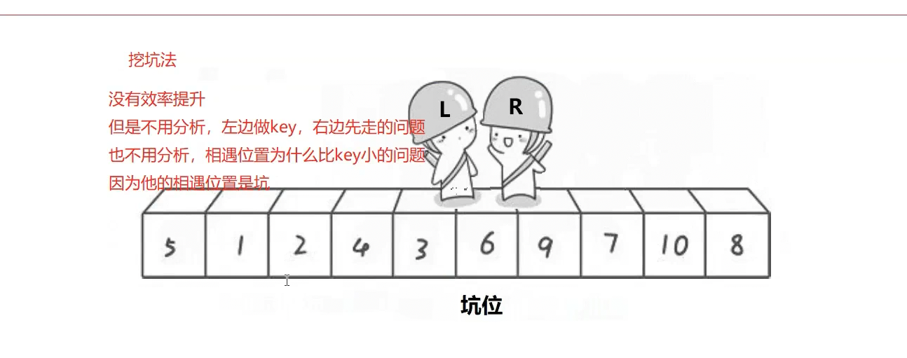 左面为key,右边找小甩到左面坑,右面形成新的坑,左面找大,甩来甩去,最后一定相遇在坑上,因为他们其中一个一定是坑,把key放进来 ,效率没有提升,单趟没有效率提升空间,都是oN,这种方法更好理解,不用怀疑相遇位置为什么比Key小,左面作key不能左面先走,