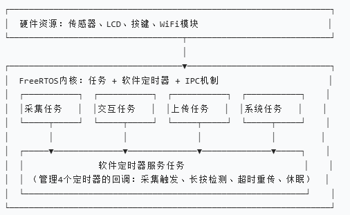 - 优先级:上传任务(3)> 按键任务(2)> 采集任务(1)(高优先级任务可抢占低优先级任务)。
