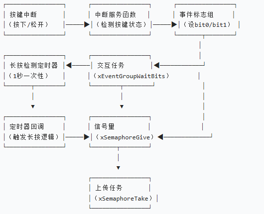 {EventBits_t xBits;while (1){// 等待按键按下(bit0)或松开(bit1)xBits = xEventGroupWaitBits(xKeyEvents,(1 << 0) | (1 << 1), // 等待的标志位pdTRUE, // 清除标志位pdFALSE, // 任意标志满足portMAX_DELAY);if (xBits & (1 << 0)) // 按键按下{printf("按键按下→启动长按检测\r\n");xTimerStart(xLongPressTimer, 0); // 启动1秒定时器}else if (xBits & (1 << 1)) // 按键松开{printf("按键松开→停止长按检测\r\n");// 若长按定时器未触发(1秒内松开)→ 短按if (xTimerIsTimerActive(xLongPressTimer))//判断是否超时{// 若1秒内松开→短按,触发上传xTimerStop(xLongPressTimer, 0);// 停止定时器xSemaphoreGive(xUploadSem); // 给信号量:触发上传任务}// 有操作→重置休眠定时器xTimerReset(xSleepTimer, 0);}}
