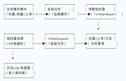 {printf("5秒无操作→自动休眠\r\n");// 挂起核心任务vTaskSuspend(xCollectTaskHandle);vTaskSuspend(xUploadTaskHandle);vTaskSuspend(xKeyTaskHandle);