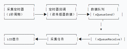 总结:创建周期性定时器,在定时器回调函数每隔1s读传感器数据,然后将数据发送给队列。采集任务接收到队列的数据之后,进行滤波、计算等复杂操作,然后进行LCD显示。