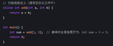 内联函数通过 “原地展开” 函数体,消除了这些调用开销,从而提升程序运行效率。