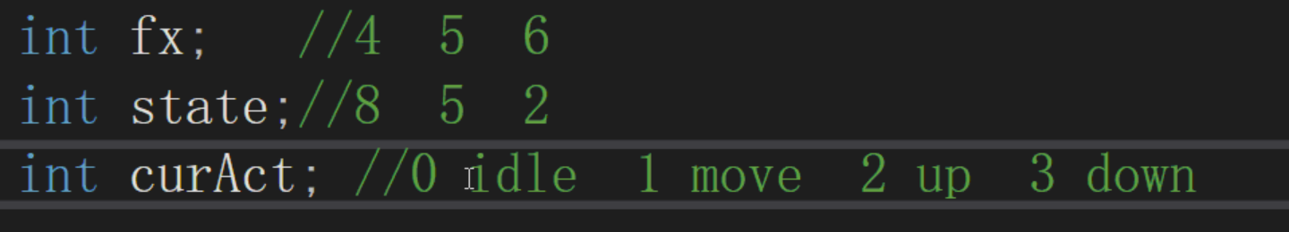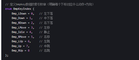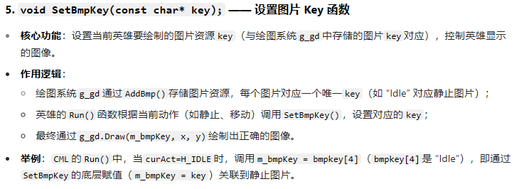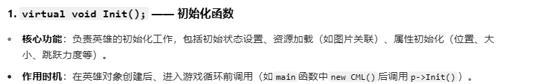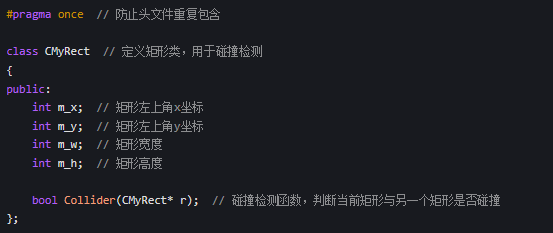 protected:const char* m_key; // 绘制用的图片keyint m_x; // x坐标int m_y; // y坐标int m_w; // 宽度int m_h; // 高度public:virtual ~CZA(); // 析构函数void SetBmp(const char* key); // 设置图片keyvoid SetPos(int x, int y); // 设置位置void SetWH(int w, int h); // 设置宽高int GetX(); // 获取x坐标int GetY(); // 获取y坐标virtual CMyRect GetRect(); // 获取碰撞矩形virtual void Run(); // 帧更新(绘制自身)virtual void Init(); // 初始化virtual void End(); // 结束清理virtual void ColliderFun(CHero* hero, int fx); // 碰撞处理函数