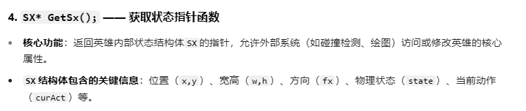 {if (hero == 0) // 英雄为空则失败return false;// 获取英雄的状态(位置、大小)SX* p = hero->GetSx();CMyRect r1; // 英雄的碰撞矩形r1.m_x = p->x;r1.m_y = p->y;r1.m_w = p->w;r1.m_h = p->h;// 遍历所有障碍物,检测碰撞std::list<CZA*>::iterator it;for (it = m_ZAList.begin(); it != m_ZAList.end(); ++it){// 若当前障碍物与英雄碰撞if ((*it)->GetRect().Collider(&r1)){(*it)->ColliderFun(hero, fx); // 调用障碍物的碰撞处理函数return true; // 碰撞成功}}return false; // 无碰撞