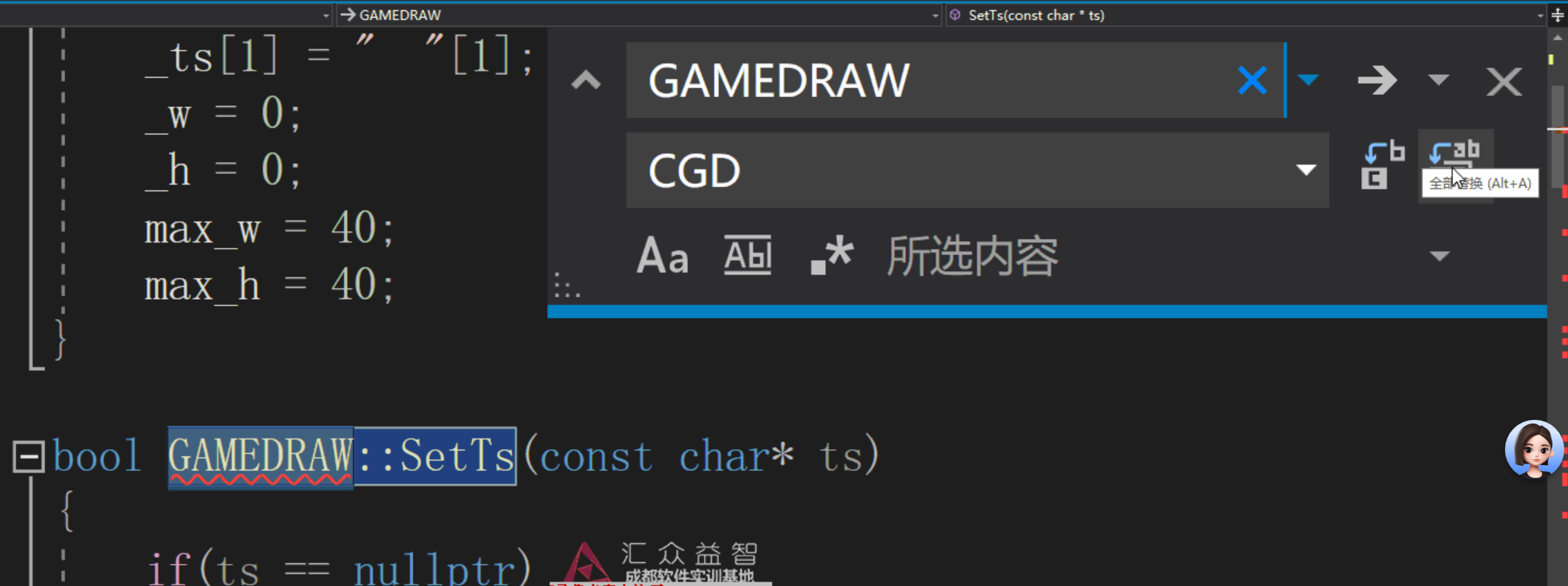 {std::map<const char*, BMP> bmpmap; // 图片资源映射表(键:图片名称,值:BMP结构体)char _ts[128]; // 纹理集(存储实际显示的字符,每个图片索引对应纹理集中的2个字符)int _tslen; // 纹理集长度(图片索引的最大数量)char pint[(40 * 2 + 1) * 40 + 1]; // 输出缓冲区(存储最终要显示的字符,含换行)int client[1600]; // 屏幕像素缓冲区(max_w*max_h=40*40=1600,存储每个位置的图片索引)int max_w; // 最大宽度(40)int max_h; // 最大高度(40)int _w; // 当前屏幕宽度(可通过SetWH设置)int _h; // 当前屏幕高度(可通过SetWH设置)public:~CGD(); // 析构函数:释放图片资源void Init(); // 初始化:设置默认值void Begin(); // 开始绘制:清空屏幕缓冲区void End(); // 结束绘制:将缓冲区内容输出到屏幕bool SetTs(const char* ts); // 设置纹理集bool Draw(const char* key, int x ,int y); // 绘制图片(根据key在(x,y)位置绘制)bool SetWH(int w, int h); // 设置屏幕宽高(需在max_w和max_h范围内)bool AddBmp(const char* key, int w, int h, const char* map); // 添加图片资源