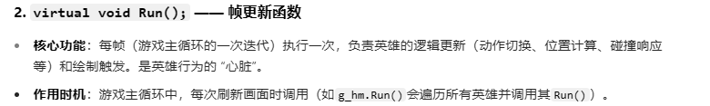 {int len = m_HeroList.size(); // 获取英雄数量for(int i = 0; i < len; ++i){ m_HeroList[i]->Run(); // 逐个更新}