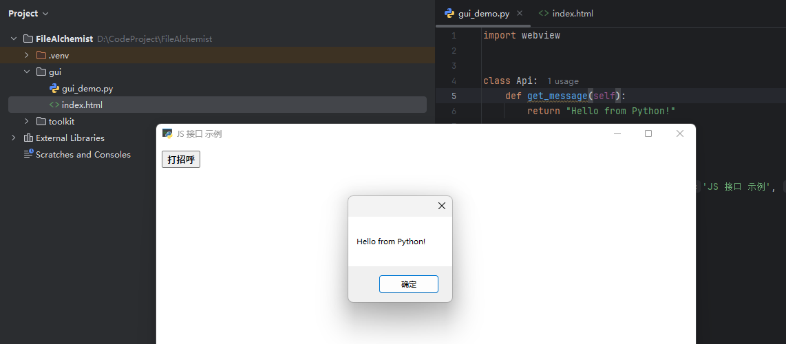 import webviewclass Api:def get_message(self):return "Hello from Python!"if __name__ == '__main__':api = Api()window = webview.create_window('JS 接口 示例', 'index.html', js_api=api)webview.start()