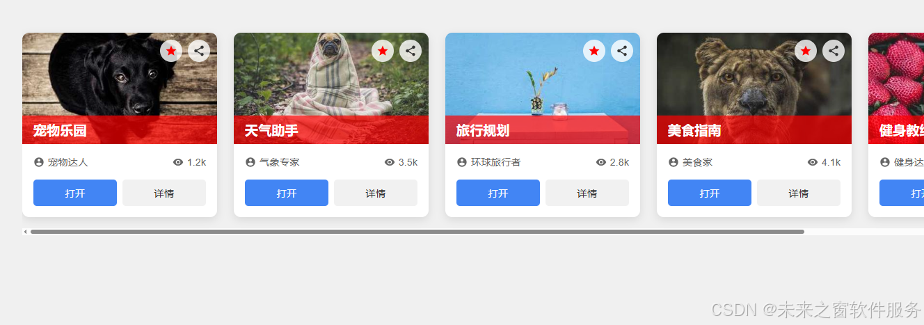 - 应用卡片构建:应用卡片的背景图片(.app - bg)犹如法宝匣子上神秘的符文图案,不同的应用对应不同的背景,从宠物乐园到天气助手,各自展示独特魅力。标题(.app - title)如同匣子上的醒目标识,以醒目的红色半透明背景突出显示。而卡片上的各种图标(.app - icon),像法宝上镶嵌的灵晶,具有收藏、分享等功能。当鼠标悬停,就像注入灵力激活了它们,显示出对应的功能描述。