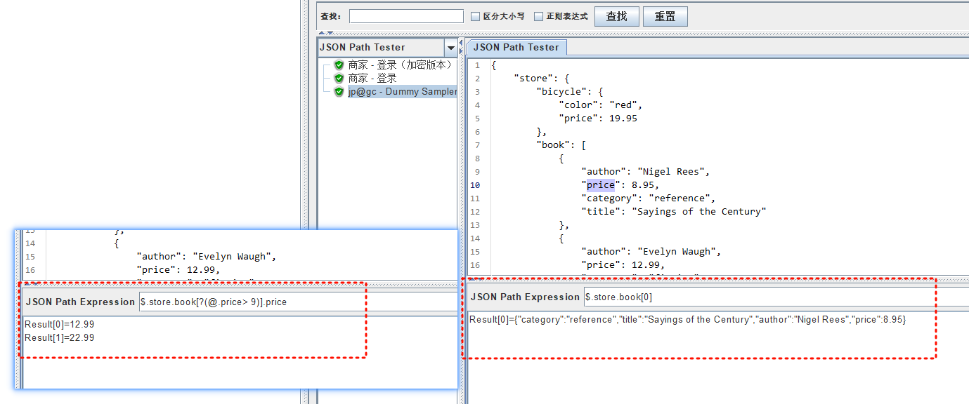 一个典型的过滤器:获取所有价格大于9的价格数,$.store.book[?(@.price> 9)].price,其中