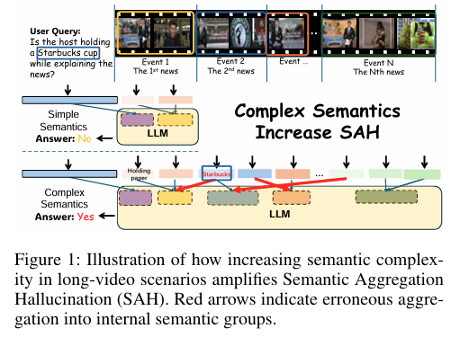 SAH是一种在长视频中尤为突出的幻觉类型,它发生在将帧级语义聚合为事件级语义组的过程中。在长视频中,由于多个事件的时间扩展和语义连贯性,模型容易在跨事件语义归属上出错,导致错误地关联视觉线索和概念。例如,模型可能正确感知每帧的视觉语义,但在将语义分配到不同事件时出错,从而产生与视频内容不一致的描述。
