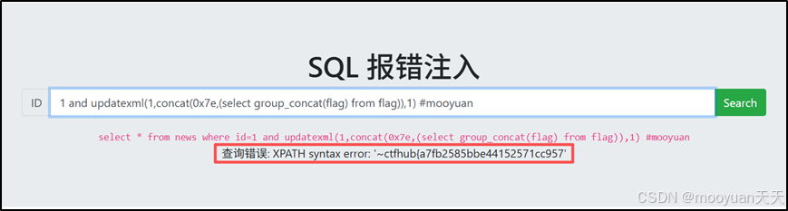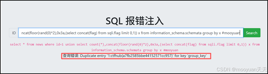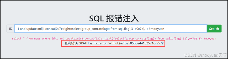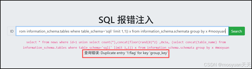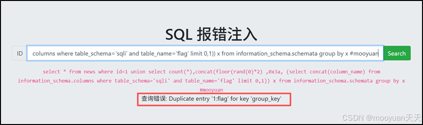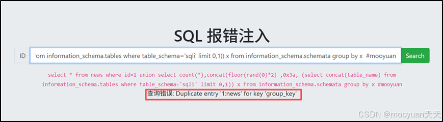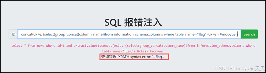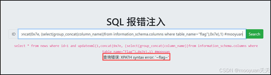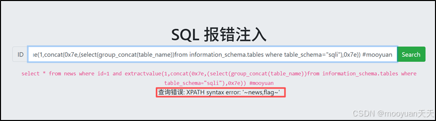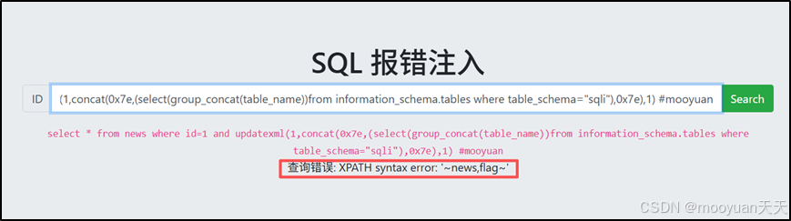 此语句会将当前数据库下的所有表名合并成一个字符串,提交后,页面输出报错信息,从中提取出flag和news就是数据库中的表格,其中flag表就是我们要下一步查询的表格。