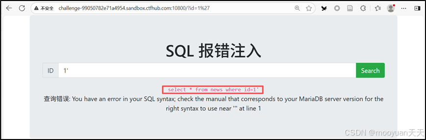 访问目标页面,通过引入特殊字符触发错误,若页面返回详细的数据库错误信息则证明存在SQL注入风险且未屏蔽错误。输入注入语句 1' ,关注SQL语句的变化和返回结果。
