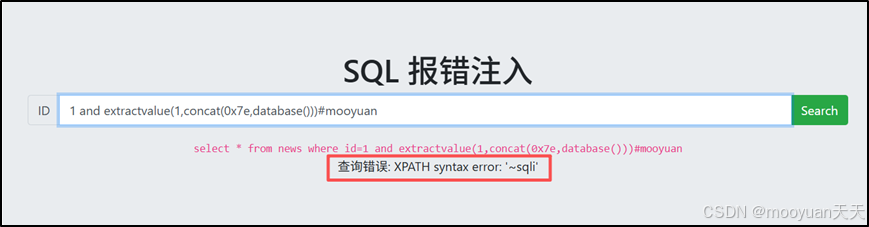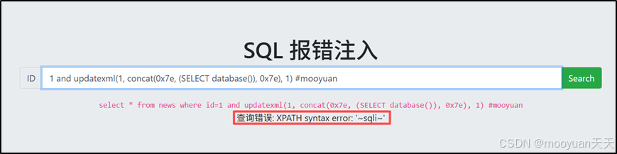 报错注入的核心是利用数据库函数故意触发错误,并将查询结果带到错误信息中,本部分使用函数updatexml()进行渗透。