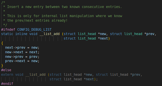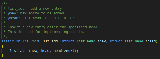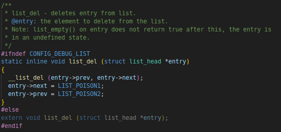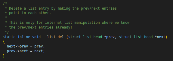 注意:__list_add 和 __list_del 等前加static,即 list 函数内部使用的函数,不进行调用