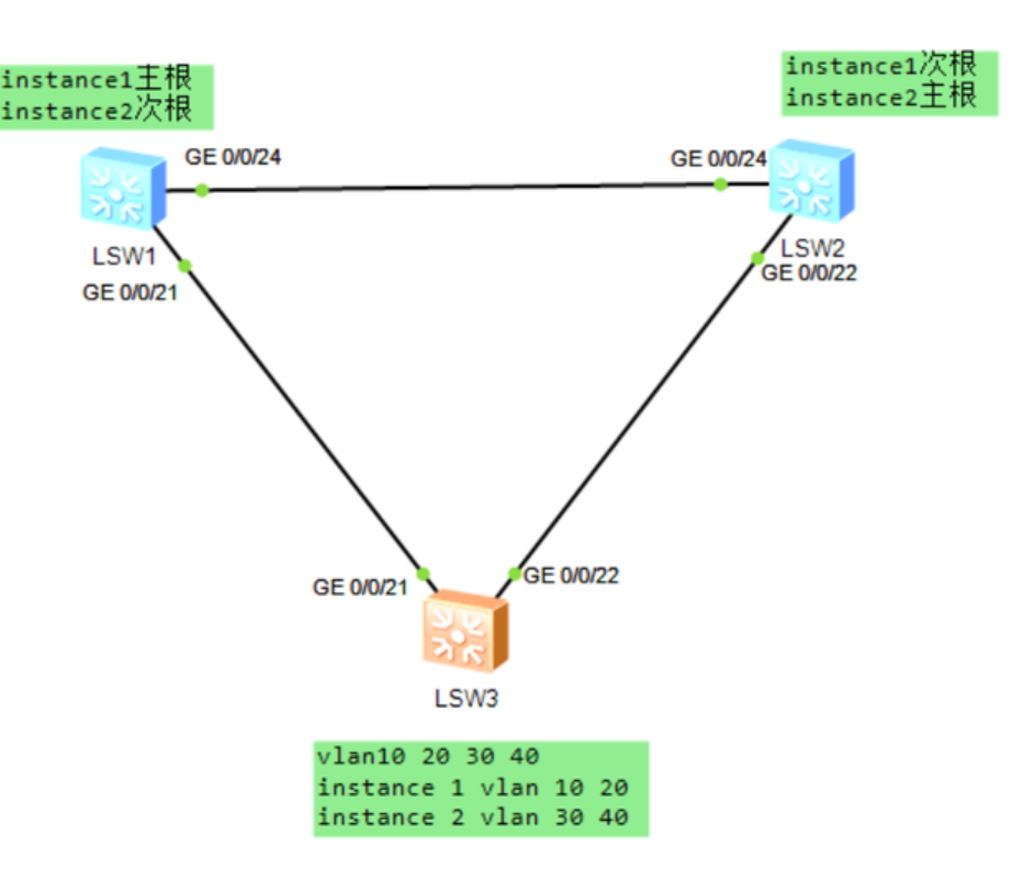 # 在SW-Core-A上,配置其为实例1的主根,实例2的备根[SW-Core-A] stp instance 1 root primary[SW-Core-A] stp instance 2 root secondary# 在SW-Core-B上,配置其为实例2的主根,实例1的备根[SW-Core-B] stp instance 2 root primary[SW-Core-B] stp instance 1 root secondary