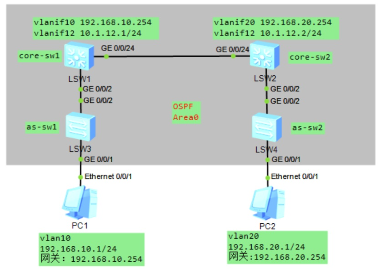 [SW-Core] vlan batch 10 20[SW-Core] interface gigabitethernet 0/0/24 # 连接SW-Access1的接口[SW-Core-GigabitEthernet0/0/24] port link-type trunk[SW-Core-GigabitEthernet0/0/24] port trunk allow-pass vlan 10 20[SW-Core-GigabitEthernet0/0/24] quit[SW-Core] interface gigabitethernet 0/0/23 # 连接SW-Access2的接口[SW-Core-GigabitEthernet0/0/23] port link-type trunk[SW-Core-GigabitEthernet0/0/23] port trunk allow-pass vlan 10 20