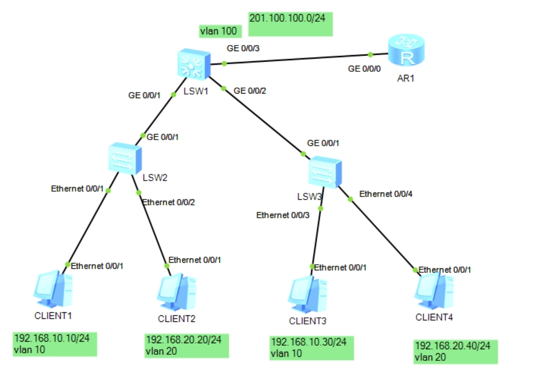 [SW-Core] interface gigabitethernet 0/0/1[SW-Core-GigabitEthernet0/0/1] port link-type access # 接口模式设为access[SW-Core-GigabitEthernet0/0/1] port default vlan 10 # 划入VLAN 10[SW-Core-GigabitEthernet0/0/1] quit