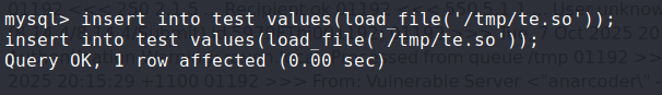 insert into test values(load_file('/tmp/te.so'));