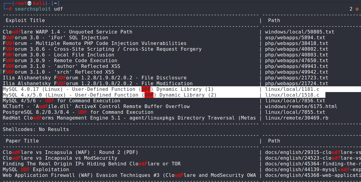 再次使用kali一把梭, searchsploit udf ,查找udf漏洞,我们要找的是提权类型的