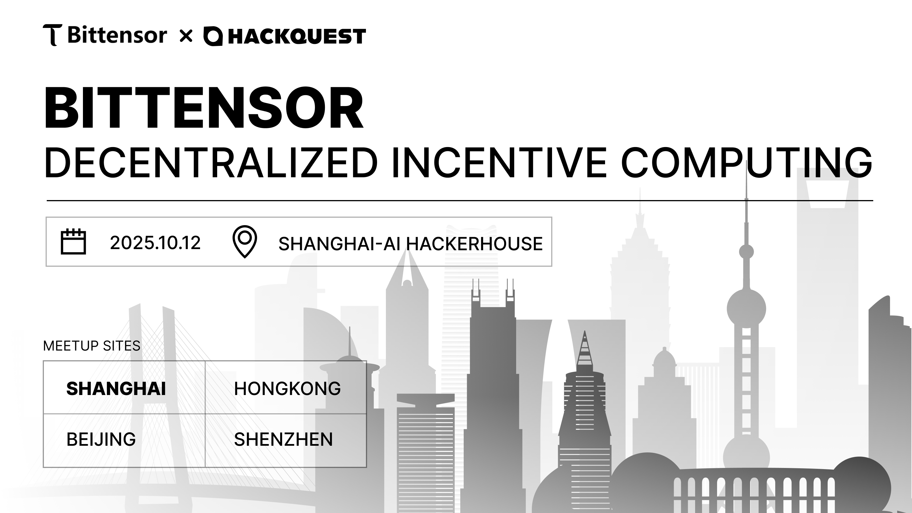 由 Bittensor 与 HackQuest 联合发起的中国巡回 Meetup & Unitour 即将启程,我们期待与你——这个生态未来的构建者、参与者与受益者——面对面,探讨如何共同塑造一个开放、协同与激励的AI新范式。