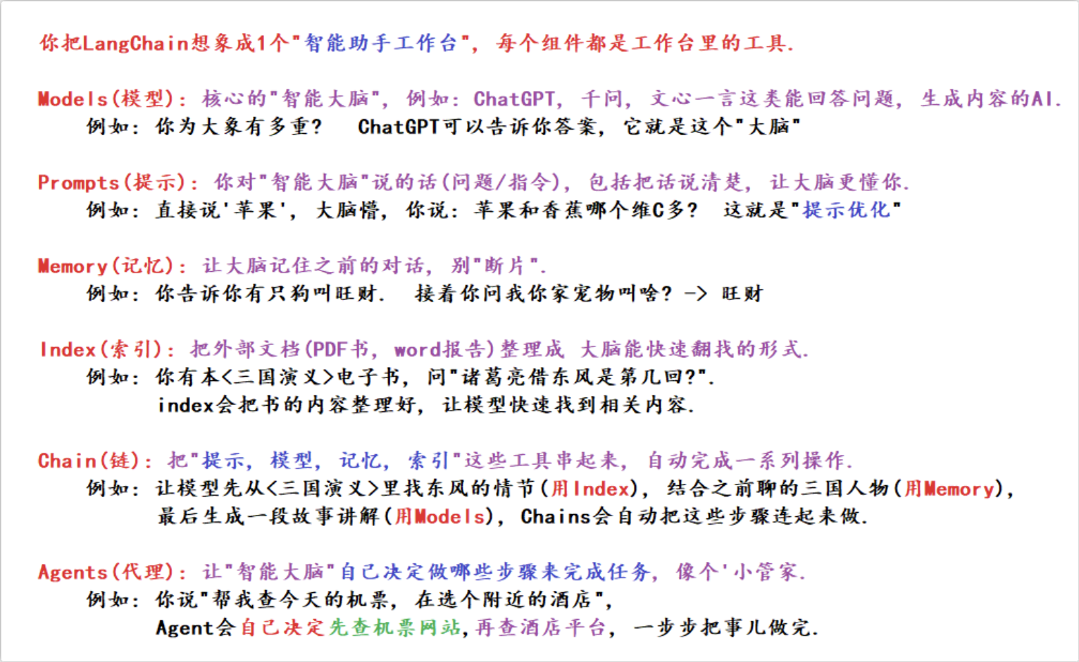 LangChain 则像是 “律师的办公系统”—— 提供案例库检索(RAG)、日程管理(Memory)、文书工具集成(Tools)等功能,让律师能更高效地处理实际案件,而不是教律师 “如何成为法律专家”。