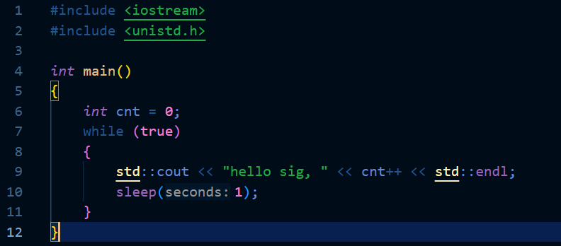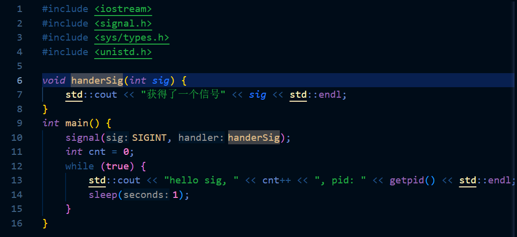 #include <unistd.h>void PrintPending(sigset_t &pending) {printf("我是一个进程(%d), pending: ", getpid());for (int signo = 31; signo > 0; signo--) {if (sigismember(&pending, signo)) {std::cout << "1";} else {std::cout << "0";}}std::cout << std::endl;