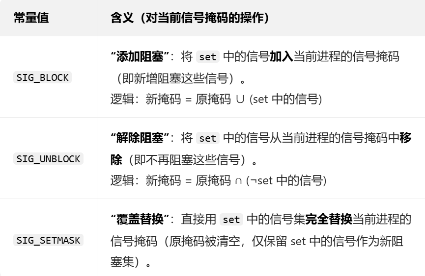 如何修改当前进程的信号掩码,必须传入以下 3 个预定义常量之一,决定了 set