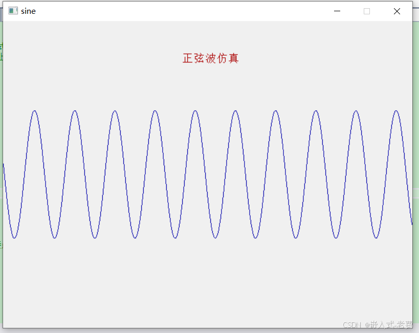 {int prevX = -1;int prevY = -1;setlinecolor(BLUE); // 设置线条颜色为蓝色BeginBatchDraw();for (int x = 0; x < WIDTH; x++){int y = (int)(AMPLITUDE * sin((x + offsetX) * 0.1* FREQUENCY) + HEIGHT / 2);if (prevX != -1 && prevY != -1) //过滤第一个点{line(prevX, prevY, x, y);}prevX = x;prevY = y;}settextcolor(RED); // 设置文字颜色为红色settextstyle(20, 0, L"Arial"); // 设置字体样式和大小outtextxy(280, 50, L"正弦波仿真"); // 在屏幕上方位置显示文字FlushBatchDraw();